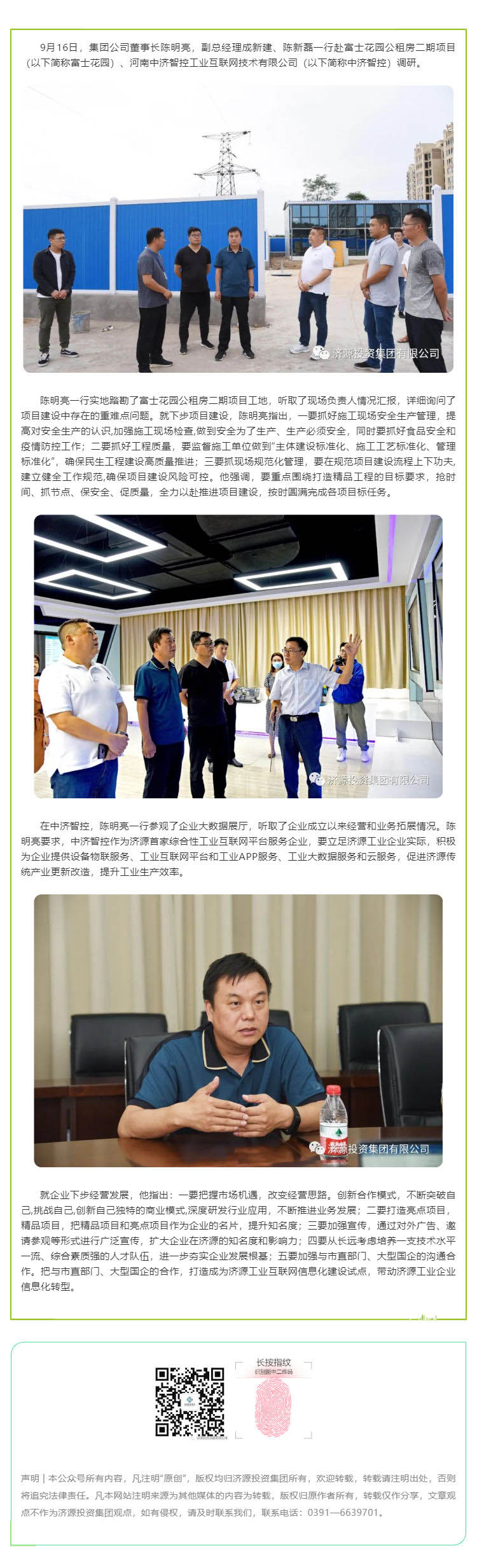 9月16日,濟(jì)源投資集團(tuán)董事長(zhǎng)陳明亮,副總經(jīng)理成新建、陳新磊一行赴富士花園公租房二期項(xiàng)目(以下簡(jiǎn)稱富士花園)、河南中濟(jì)智控工業(yè)互聯(lián)網(wǎng)技術(shù)有限公司(以下簡(jiǎn)稱中濟(jì)智控)調(diào)研。